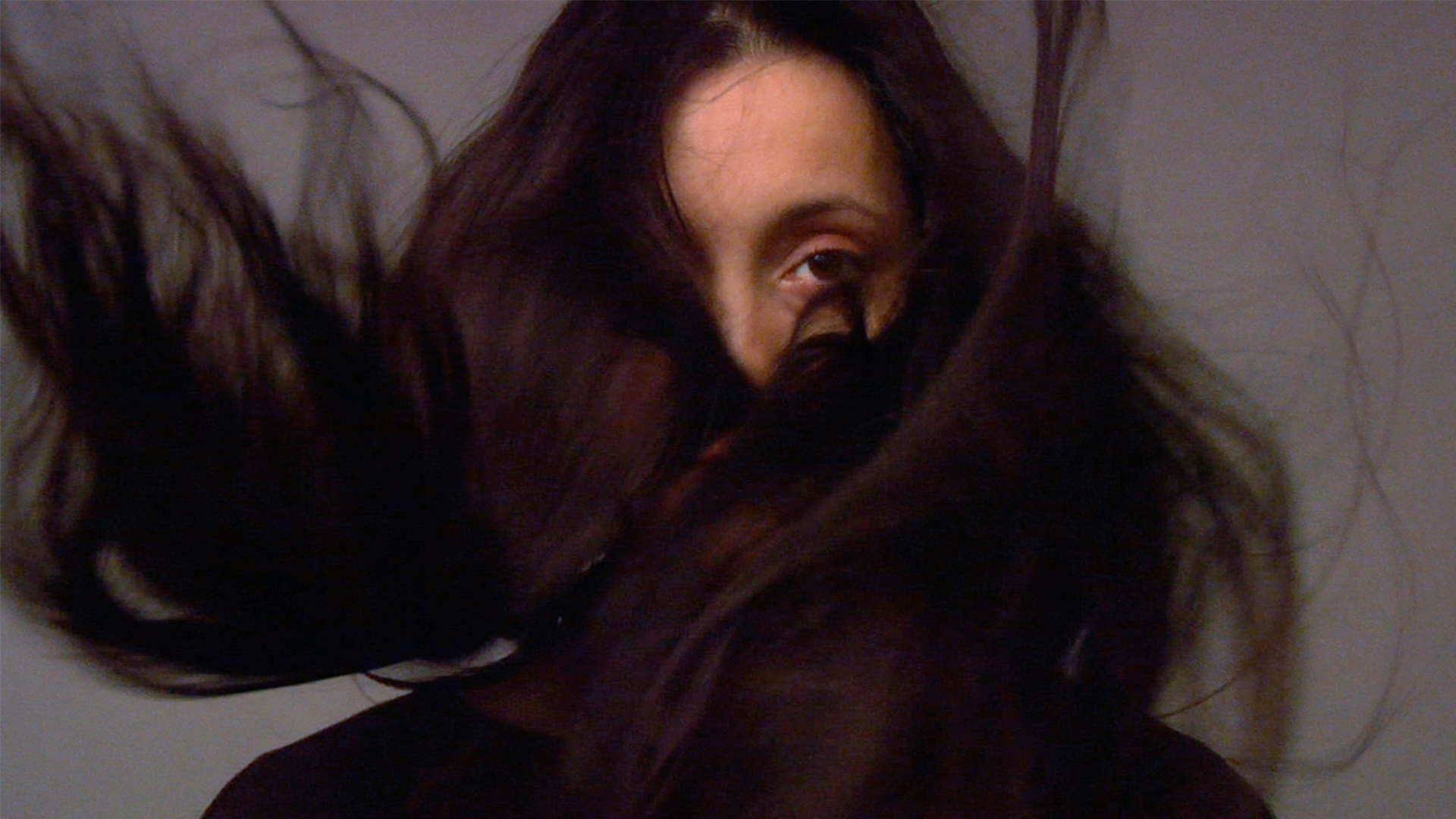 Pysäytyskuva Karjalaisen videoteoksesta Woman with Dark Hair. Teos on osa säätiön taidekokoelmaa.